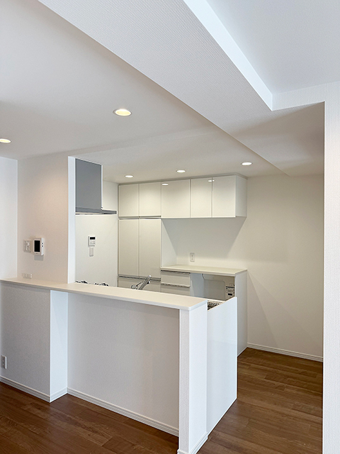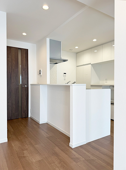 リフォーム前は『壁付けキッチン』でお使いだった為、お友達とお酒を飲みながらキッチンに立てる『セミオープンキッチンが理想』とのご希望でした。
