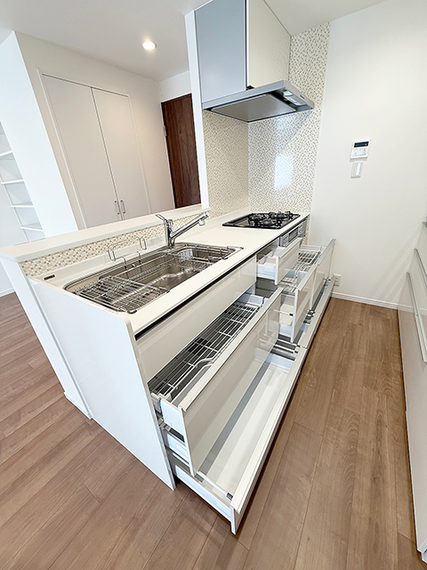 キッチン側には吊戸は設置せず、キッチンバックにトールタイプ収納と家電収納をレイアウト致しました。光沢のあるキッチン扉とホワイトの人造大理石は、お部屋全体を明るくします。
